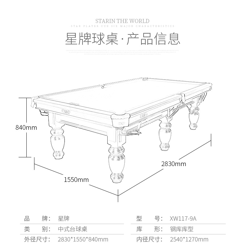 星牌 臺球桌 XW117-9A中式黑八鋼庫球臺